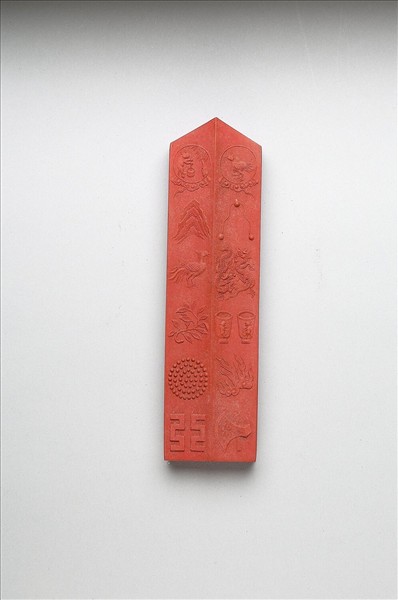 尖首圭形硃墨。一面邊框起棱,墨面中有填金「有虞十二章」隸字,題銘之上下方分別模印雲紋與波濤紋為飾。另面則模印有虞十二章圖像。墨側有「大清乾隆年製」、「古華軒珍藏」楷款。