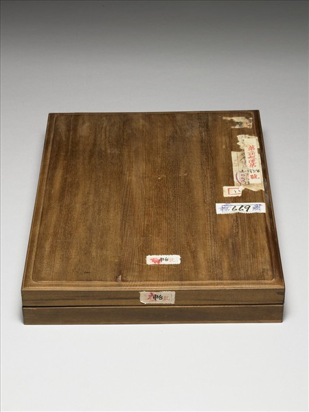 四方形木盒,表面光素無紋,內襯裱綾座,並依所盛裝之墨形內凹以盛墨。共儲有羅漢圖墨十六塊,合稱為十六應真墨。