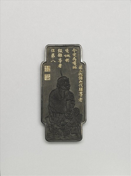 長方形黑墨,邊框起棱,兩長邊向外突出直邊,使外廓近亞形。墨一面有羅漢圖象,並有金書楷字羅漢尊名與清高宗改定後名號:「第二迦諾迦伐蹉尊者,今定為嘎納嘎(哈拔)喇綴雜尊者位第八」;另面則為清高宗詠讚該羅漢之贊文。同類墨共有十六方(中文421-436),即成十六羅漢套墨,院藏此套墨皆全,同儲於木盒中。由於歷史上分別有十六羅漢與十八羅漢之說,清高宗曾以此詢之章嘉國師,並從而釐定十六羅漢尊名與次序,此墨之圖像次序與尊名,即按照清高宗對十六羅漢的認知來更定製作。