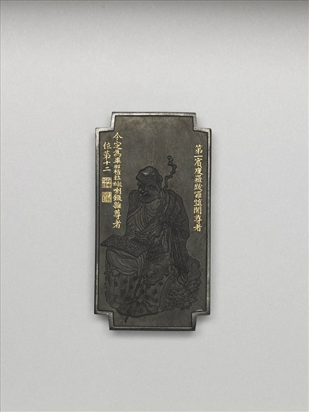 亞字形黑墨,邊框起棱。墨一面有羅漢圖象,並有金書楷字羅漢尊名與清高宗改定後名號:「第一賓度羅跋羅墯闍尊者,今定為畢那楂拉(哈拔)喇綴雜尊者位第十二」;另面則為清高宗詠讚該羅漢之贊文。同類墨共有十六方(中文421-436),即成十六羅漢套墨,院藏此套墨皆全,同儲於木盒中。由於歷史上分別有十六羅漢與十八羅漢之說,清高宗曾以此詢之章嘉國師,並從而釐定十六羅漢尊名與次序,此墨之圖像次序與尊名,即按照清高宗對十六羅漢的認知來更定製作。
