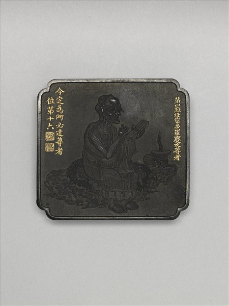 黑墨,四方形,委角內凹,邊框起棱。墨一面有羅漢圖象,並有金書楷字羅漢尊名與清高宗改定後名號:「第四難提密多羅慶友尊者,今定為阿必達尊者位第十六」;另面則為清高宗詠讚該羅漢之贊文。同類墨共有十六方(中文421-436),即成十六羅漢套墨,院藏此套墨皆全,同儲於木盒中。由於歷史上分別有十六羅漢與十八羅漢之說,清高宗曾以此詢之章嘉國師,並從而釐定十六羅漢尊名與次序,此墨之圖像次序與尊名,即按照清高宗對十六羅漢的認知來更定製作。