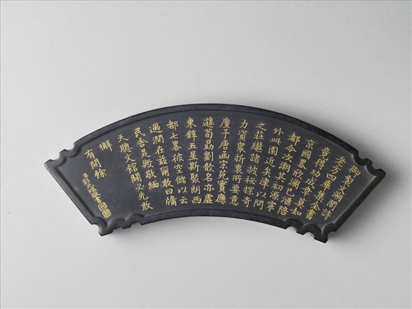 三層方盒中盛放兩套〈御製四庫文閣詩墨〉,每套五方,兩兩相同,形狀各異,是清代流行的集錦墨。每方墨一面陰刻填金楷書御製詩,另一面刻文閣圖。此為摺扇扇面形的〈御製文溯閣詩墨〉,模印彭元瑞金字楷書清高宗詠文溯閣詩作,另一面模印園景。嘉慶年間成書、汪近聖(1692-1761)後人輯錄的《鑑古齋墨藪》,收錄此套墨。乾隆四十七年(1782)文溯閣最後建成,該墨應晚於此。汪氏為徽墨名家,是清代徽州貢墨之一,《績溪縣誌》記載,乾隆六年(1741)其子汪惟高曾應召入京。彭元瑞(1731-1803)官至工部尚書、協辦大學士,與鑒古齋關係深厚。此套墨漆黑光亮,細密堅輕,雕刻細膩,品質精良,同時四幅文閣圖乃以描繪實景為本,亦為難得的重要史料。