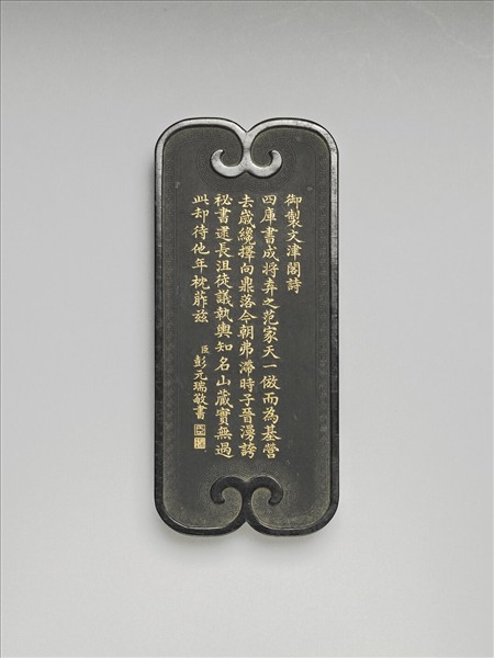 三層方盒中盛放兩套〈御製四庫文閣詩墨〉,每套五方,兩兩相同,形狀各異,是清代流行的集錦墨。每方墨一面陰刻填金楷書御製詩,另一面刻文閣圖。此為雲頭長形的〈御製文津閣詩墨〉,模印彭元瑞金字楷書清高宗詠文津閣詩作,另一面模印山水樓閣。嘉慶年間成書、汪近聖(1692-1761)後人輯錄的《鑑古齋墨藪》,收錄此套墨。乾隆四十七年(1782)文溯閣最後建成,該墨應晚於此。汪氏為徽墨名家,是清代徽州貢墨之一,《績溪縣誌》記載,乾隆六年(1741)其子汪惟高曾應召入京。彭元瑞(1731-1803)官至工部尚書、協辦大學士,與鑒古齋關係深厚。此套墨漆黑光亮,細密堅輕,雕刻細膩,品質精良,同時四幅文閣圖乃以描繪實景為本,亦為難得的重要史料。