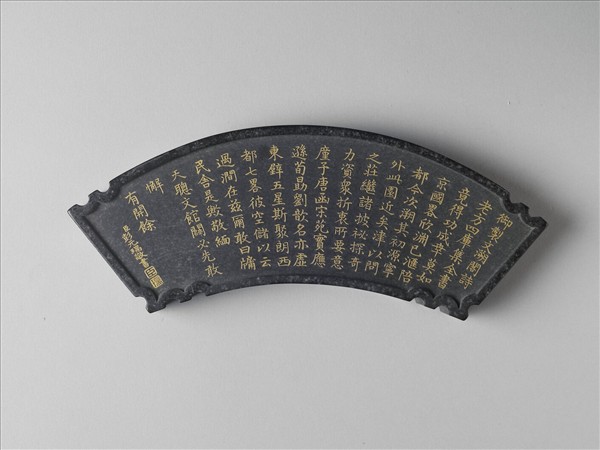 三層方盒中盛放兩套〈御製四庫文閣詩墨〉,每套五方,兩兩相同,形狀各異,是清代流行的集錦墨。每方墨一面陰刻填金楷書御製詩,另一面刻文閣圖。此為摺扇扇面形的〈御製文溯閣詩墨〉,模印彭元瑞金字楷書清高宗詠文溯閣詩作,另一面模印園景。嘉慶年間成書、汪近聖(1692-1761)後人輯錄的《鑑古齋墨藪》,收錄此套墨。乾隆四十七年(1782)文溯閣最後建成,該墨應晚於此。汪氏為徽墨名家,是清代徽州貢墨之一,《績溪縣誌》記載,乾隆六年(1741)其子汪惟高曾應召入京。彭元瑞(1731-1803)官至工部尚書、協辦大學士,與鑒古齋關係深厚。此套墨漆黑光亮,細密堅輕,雕刻細膩,品質精良,同時四幅文閣圖乃以描繪實景為本,亦為難得的重要史料。