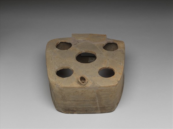 灶體呈梯形,轉角處略呈圓弧狀。灶體前端設一遮檐,檐下有一方形灶門。灶上設有五個火眼(釜孔),中央的火眼略大。無底。灶尾處設有煙囪,煙囪前端略為外侈,中央略上處有一凸稜。全器僅於灶門周圍飾有菱格紋。此灰陶灶為遼陽第二號磚墓出土。