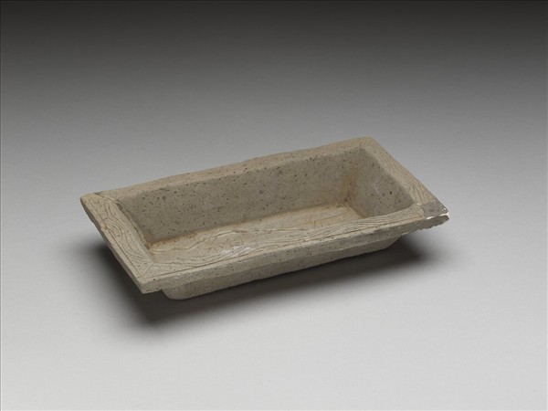 侈口,平底。器體呈長方形,口沿向外平折。器壁平直,向器底內縮,呈120度交角。器底中央線刻魚紋乙尾,口沿處刻繪有數組曲線紋。此器出土於遼陽第三號石槨墓。