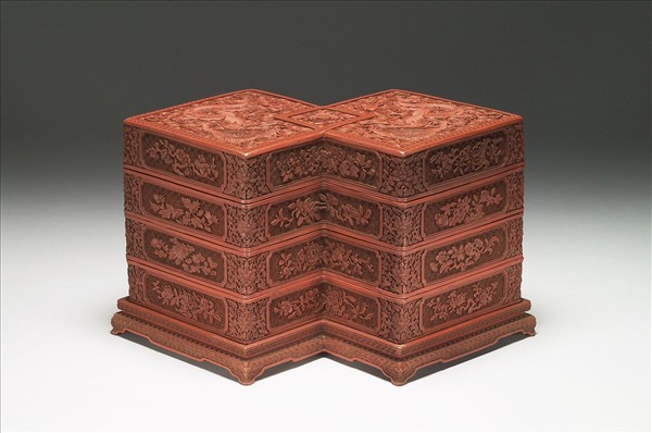 剔紅方勝式套盒,色硃紅光潤。平頂蓋,子母口,矮直壁,平底,淺足座。蓋面以波濤紋為地雕雙龍戲珠,中心有菊花團壽字,並以回紋為邊,蓋與三層套盒壁各有六處開光,內雕梅、蘭、蓮、菊、秋葵、月季、桃花等四季花卉,紋間填飾斜方回紋錦地,開光外雕飾番蓮花。座亦為方勝形,面雕紅萬字錦,有如意形足六。器裡與底髹黑色光漆。