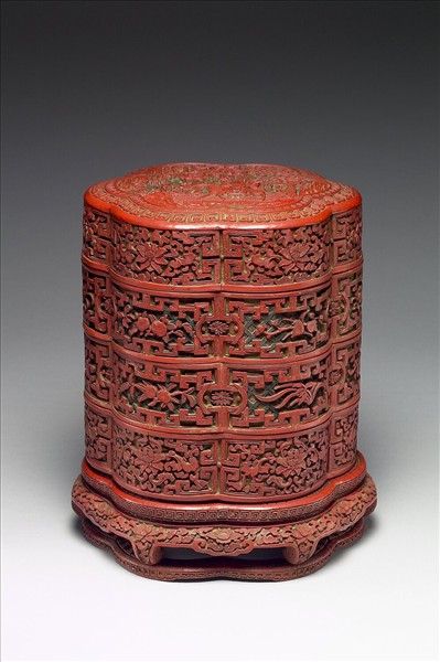 三層套盒,六瓣花式,附座。外髹紅、黃、綠三色漆,內漆黑光。蓋面雕壽星騎鹿,壽星手捧桃實,壽星、鹿與桃均有長壽吉祥之意,壽星前後各一童子,前者持磬,後者執杖,周圍以松竹山石。周壁兩層雕番蓮紋,紋間為黃色素地;兩層雕折枝花果紋,襯以菱格朵花錦紋。座面淺刻萬字錦紋,壁飾番蓮紋。器內加飾描金花卉紋。