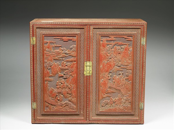 長方立式小櫃,有門二扇,櫃內以暗屜分成二層,空間相等。屜與門皆有金屬飾件以供開闔。門上方形開光中剔紅山水人物為飾,山水交錯、小徑自遠方蜿蜒掩映而下,創造出畫面的深度感。就中人物有行走亦有坐騎者,皆面帶喜色且捧物遠離畫面上方之城郭。附几式漆座,座有屜。