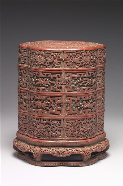 六瓣形套盒,共三層,最上層為蓋,底配有漆座。盒與漆座以剔彩技法雕刻,剔除上層的朱漆,露出下層的綠漆和黃漆。蓋面中央雕壽星騎鹿,前後各一童子,壽星手捧桃實,一童子持長杖,另一童子執磬;盒壁兩層雕番蓮紋,兩層雕桃、靈芝、水仙、石榴等花果紋,以拐子龍紋一組一組框之。內髹黑漆,並加飾描金花果紋。是一件兼具美觀與實用的古代奢侈品。