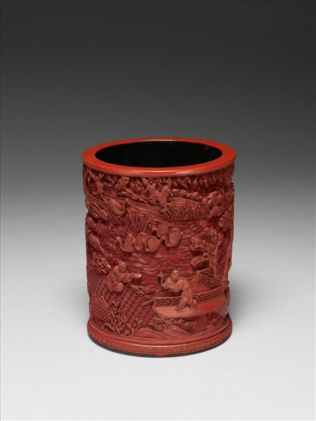 水邊屋舍內,二老者一邊讀書一邊交談,屋外童子一人捧盤傾身看著捉鵝跨橋而來的人。屋前樹木茂盛,岸邊老樹盤蔭,鵝群戲水,漆層層次變化多,水波、地面錦地滿鋪,物象安排緊湊,又以羲之換鵝為題材,是乾隆時期典型的雕漆風格。