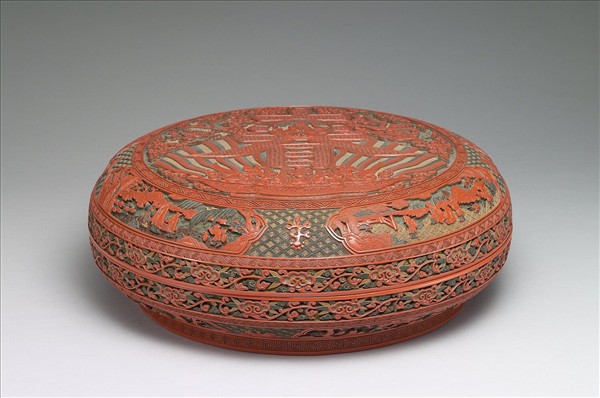 盒緣開光,內飾四組山水人物,開光間飾黃地綠漆斜格錦地,其上浮雕八寶。盒蓋大圓內一聚寶盆,滿盛各式珍寶,光芒四射,當中一大大的春字,春字中又南極仙翁,外側各一行龍,完全承襲嘉靖樣式的春壽寶盒,且尺寸比例、圖樣等也幾乎完全相同,似乎為刻意的模仿。然顏色更為多樣,綠、黃、紫褐、紅,且色彩鮮豔,刀法更為工整,具體呈現乾隆一朝的工藝水準。