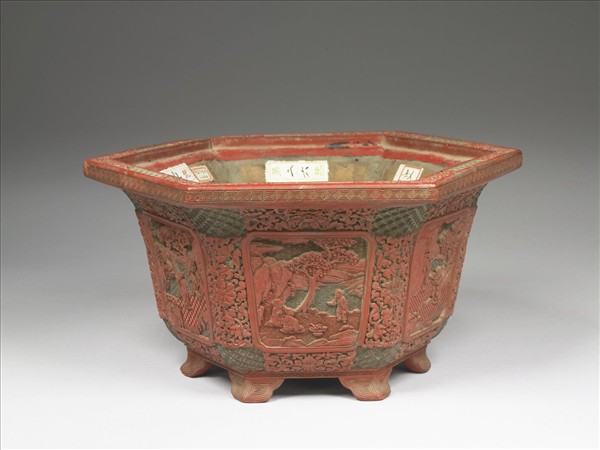 六方形花盆,黃、綠色雕漆錦地,面髹紅色漆,漆層略有剝落。廣口外撇,深壁,平底,下接六如意形足。器壁六面開光,四周雕飾番蓮花,內雕山水人物樹石,人物多持桃實靈芝,有長壽吉祥之意,開光外餘地刻滿綠框紅花斜方朵花錦地紋。盆內壁露木胎未加髹飾。