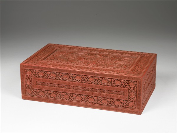 剔紅長方形匣,朱漆艷紅有光澤。罩式蓋,矮壁、底淺凹。頂與四壁均以回紋二道分隔畫面,外圍斜方回紋錦地雕纏枝番蓮花紋,四壁中央雕團形花一列,頂面中央則雕三獅戲球,獅圓睛捲鼻,毛髮捲長,周身並有火焰紋。器內為髹黑漆雙層盒,無紋飾。