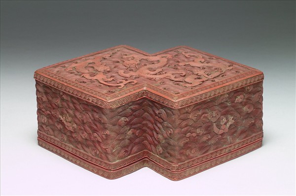剔紅方勝式盒,木胎,色硃紅。罩式蓋,淺直壁,平底。蓋面雕三龍戲於水波之上,周緣飾回紋,蓋壁亦以水波紋為地,雕珊瑚、珠、角諸寶。器周壁彩繪黃色萬字、粉紅朵花、藍地黑邊框之菱形錦地,內有繪黃與紅色回紋黑漆屜,屜裝彩雕萬字朵花錦地小方盒七。