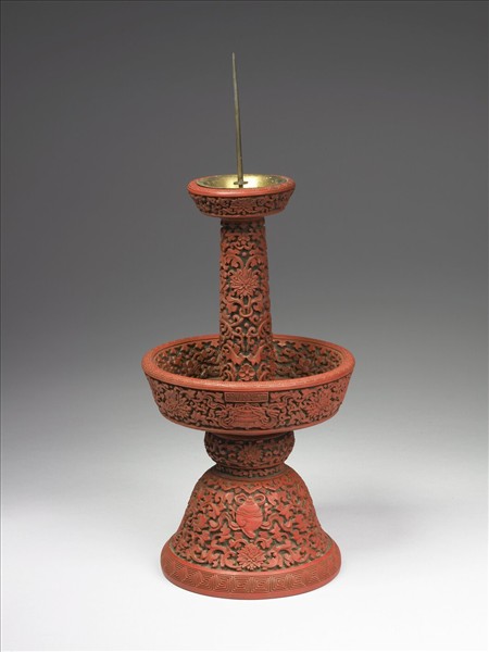 燭台,共有兩層承盤,上層附金屬燭插,足為覆鐘式。內外皆髹朱漆。兩承盤口沿、足沿各雕回紋一周,承盤內外壁、柱及足均雕捲枝番蓮紋,大承盤和足下半部雕有八寶紋,均襯以菱格朵花錦地紋。承盤口沿下一處雕「大清乾隆年製」六字篆款。為供具,一爐、二瓶、二燭台合稱「五供」,此為其中一件燭台。院藏中漆76-中漆80為一套五供。