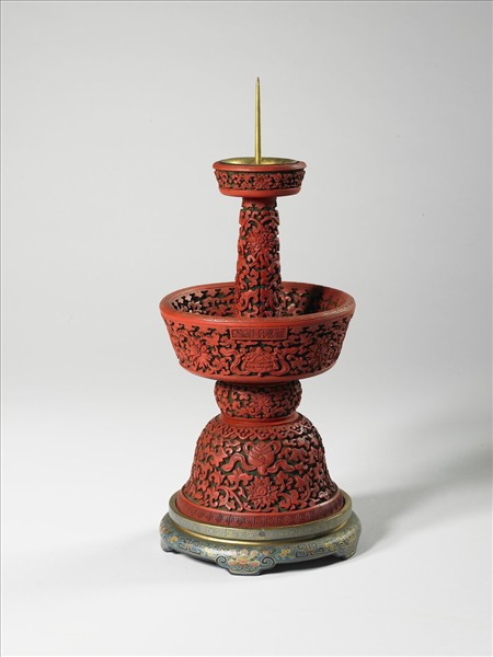燭台,上下兩層承盤,上層附金屬燭插,足為覆鐘式。內外皆髹朱漆和綠漆。承盤內外壁、柱及足均雕捲枝番蓮紋,加飾八寶紋,襯以菱格朵花錦地紋。承盤口沿下一處雕「大清乾隆年製」六字篆款。在清宮中配有一款彩木座。