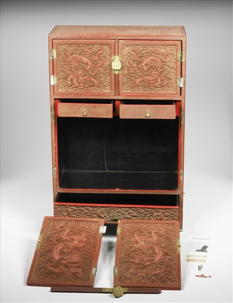 木胎,外髹朱漆,內塗黑漆。長方形櫃,分三層,上、中兩層共四扇門,中層內有暗屜二,下層為一抽屜,底有四足。四扇門剔紅龍戲珠紋,屜面雕四飛魚,均襯以波濤紋。頂、側三面雕萬字錦紋,背面雕飾菱格朵花錦地紋。