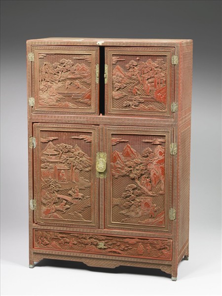 長方式立櫃,分三層,上、中兩層共四扇門,中層內有暗屜二,下層為一抽屜,底有四足,並裝有銅鎖、銅活葉,用以開合。正面剔紅山水人物,地紋雕平行回紋、水波紋、古錢紋、六方形朵花紋和菱格朵花紋等。頂、側三面雕萬字錦地紋。