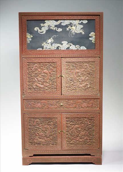 剔紅長方形小櫃,色暗紅,邊角略有傷損,漆層裂傷。立式小櫃,分四層,上層為平嵌式板,面繃繡雲龍絹布,次與末層為對開式門,二層間有抽屜,底接如意形足四,嵌門閂與圓頭把手銅飾件。全器邊界均飾回紋,正面有四個開光,雕龍戲珠於波濤之上,外飾番蓮紋,屜面雙龍戲珠,二側、頂與背咸飾繡球朵花錦地。器裡髹黑色光漆。下承剔紅雲足小平几座。