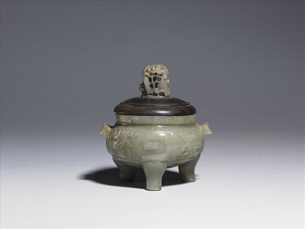 仿古青玉鼎式爐,三獸蹄形足,紋飾以回紋為地,並有變形鳳鳥紋。附後配之木蓋,木蓋上為元代汀渚鷺鷥紋玉頂。