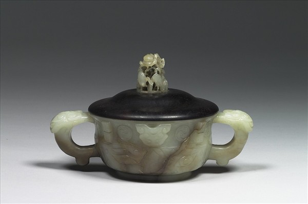 ⽟簋式爐,雙耳,圈足。玉有綹。局部染為褐色。獸⾸⽿,下有垂珥。口沿下紋飾帶為獸面、渦紋及扉稜,器腹飾大獸面紋。 附後配之玉頂木蓋,木蓋上為元代汀渚鷺鷥紋玉頂。