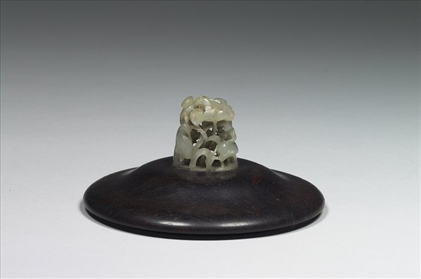 明 青⽟獸⾯簋形爐 (中玉000004)木蓋上之元代玉頂。 灰⽩⽟⾊,有赭斑鏤雕荷花葉與鷺鷥。