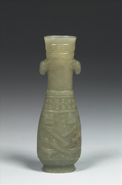 灰黃色青玉長頸瓶,雙耳,圈足。器身飾復古紋飾,兩耳為羊首形,口沿下及肩頸部飾雲紋及繩紋,腹部飾交龍紋,以回紋襯地。