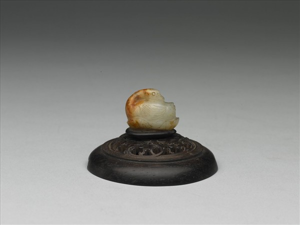 明代青⽟壽字簋形爐(中玉000010)鏤空木蓋上之元代玉頂。青灰色玉,有褐斑。做一鳧回首棲息於荷葉上。全器有上下穿,原應為佩飾。