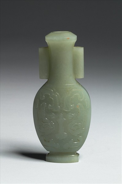 青玉扁形瓶,玉色泛綠。貫耳長頸,有圈足。腹部飾獸面紋。