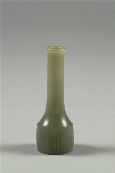 青玉小瓶,局部有赭斑。長頸、直筒腹、平底。腹部飾瓦楞直紋。