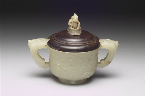 玉質,色青白略有璺。雙耳,撇口,碩腹,圈足。口緣飾相對三角形紋一圈,器腹淺浮雕蟠身螭獸多隻,首尾相連,肢體有明顯的方折感。雙耳雕龍形,作口銜爐沿狀。附後配之木蓋,木蓋上為元代鏤雕鴛鴦荷葉玉頂。