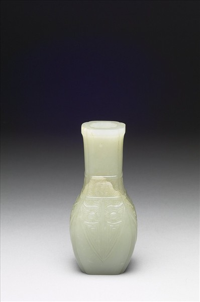 玉質,色青白微有璺。小唇口,長頸。瓶身作扁圓形,四角有折並劃棱線,略呈四瓣,每瓣紋飾各自獨立。器頸部有二圓凸弦紋,內以回紋為地淺浮雕獸面紋,器腹為蕉葉紋,中飾一對眼睛,圓睛長粗眉。