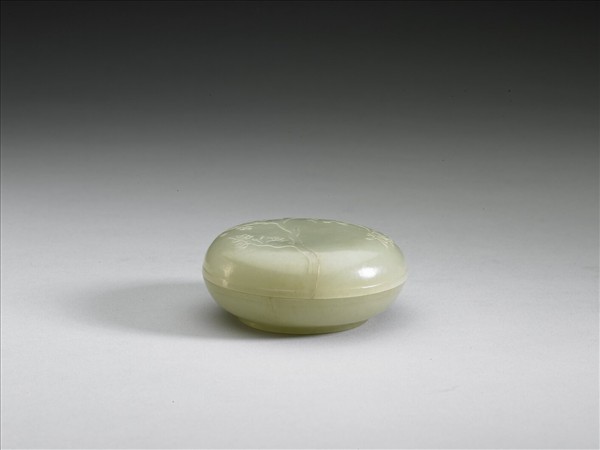 青玉。圓扁盒,平頂蓋、子母口、平底、淺圈足。蓋飾淺浮雕梅枝。