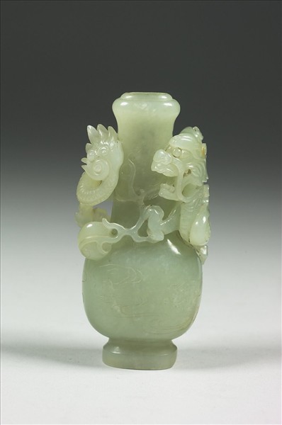 青玉,口緣圓凸、直頸、深腹、高圈足。立雕神龍及火焰寶珠環繞頸部,腹飾陰刻雲紋。