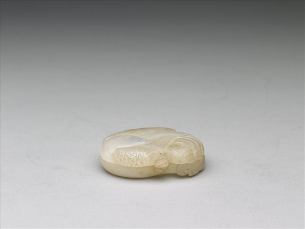 白玉泛灰。全器作回首鳥形,蓋與器身略相等,蓋面有鳥首、翼等,器身琢羽翼與二足。以陰刻細線表現出鳥羽質感。