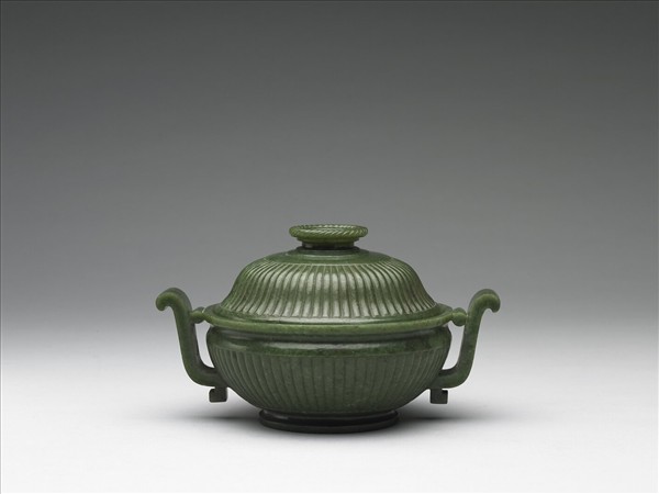 碧玉質簋式爐,附蓋,圈足。蓋與腹飾直棱紋,蓋鈕作繩索形。