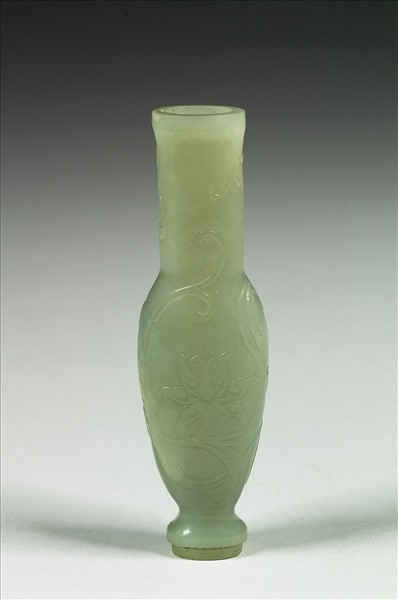 青灰玉,有大片黃灰白色璺、綹。長頸小瓶。有圈足。腹部飾以番蓮花葉。圈足下方有突榫,其上有黑色膠,原應為插嵌於某物上。