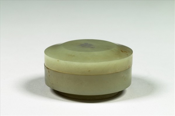 青灰玉質,有赭斑。圓盒,凸圓蓋,直壁,有圈足。