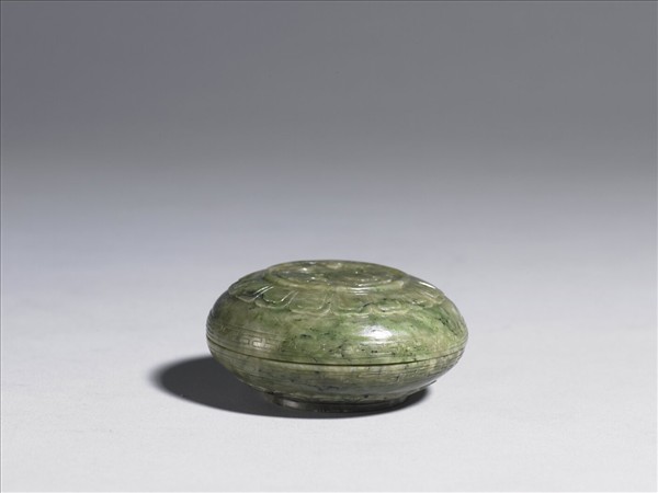 碧玉質,玉色略泛黃。蓋與器身略相等,弧形壁,有圈足。蓋面正中浮雕夔龍紋,外圈以蓮瓣紋,蓋沿處則作回紋,器口沿飾有回紋,腹壁飾蓮瓣紋。