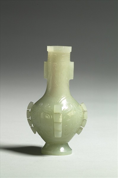 白玉質瓶。長頸、鼓腹、有圈足。全器飾仿古銅器紋飾:頸部為蕉葉紋,兩側有似貫耳的實心半圓柱,腹部為四個獸面紋,並加飾每個獸面中心有一道扉稜。