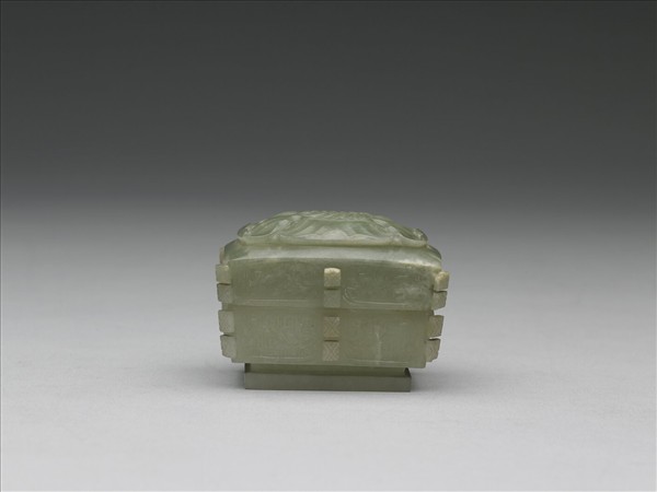 青玉質,玉色泛綠。方形盒,四角及四面中線各有扉棱一道,有圈足。蓋面浮雕罌粟花,腹部飾有莨苕葉,以回紋為地。