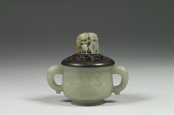 玉質。簋形爐,兩耳,耳作獸首形,有珥,有圈足。口沿有一周回紋,腹部飾獸面紋,中有一道回紋。附玉頂鏤空木蓋,灰黃玉色,有大片赭斑,鏤雕鷺鷥荷葉。