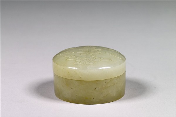 青玉質,玉色泛黃。小圓盒,蓋面圓凸,直壁、平底、底心微凹入。蓋面淺浮雕一「壽」字,外繞卷雲紋。