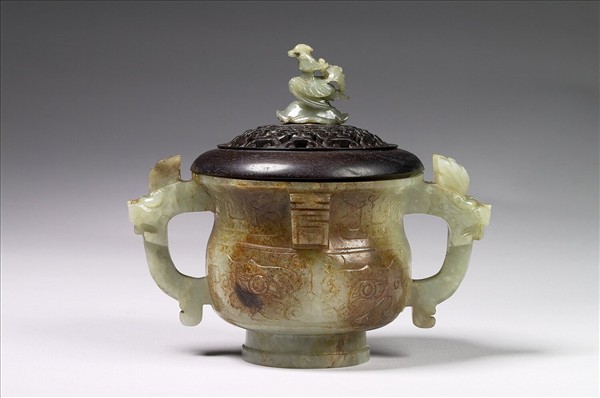 玉質,有大片赭色人工沁斑。器仿西周青銅簋造型。口外敞,斜肩,圓腹,高圈足,雙獸耳,下有珥。頸部飾壽字及夔紋,腹部飾以獸面紋,兩耳各雕一有大角之龍首。附後配之玉鼎及鏤空木蓋。玉頂為元代之鴛鴦荷葉立雕。