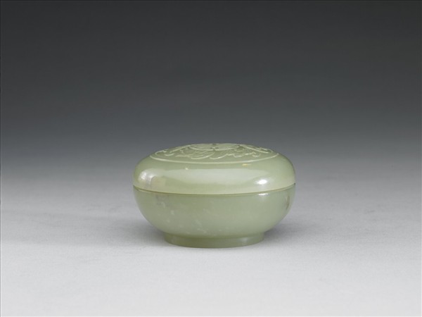 青玉圓盒,有圈足。蓋面琢一圓框,正中浮雕一團壽字,圍飾五隻飛舞蝙蝠。寓意「五福捧壽」。