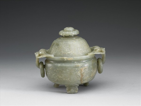 青玉,帶赭灰沁斑。爐圓形,口有折邊,碩腹,帶三葉形小足,雙耳下有活環,帶蓋。腹與蓋浮雕花卉紋飾,雙耳亦雕花葉紋,蓋鈕作花瓣式。