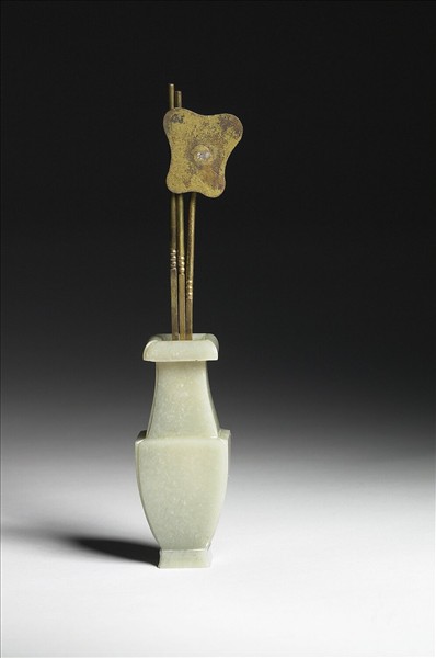 青玉,帶白色沁斑。口唇外捲,長頸,上窄下寬,直腹下斂,方形圈足。四邊各有一細線凹槽。此瓶附香著及扇形香鏟。