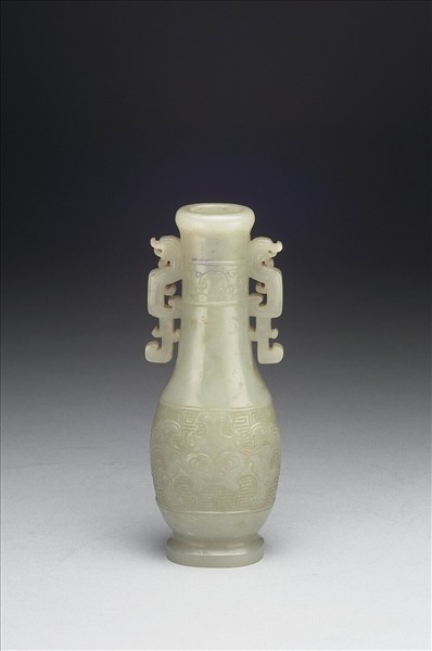 青玉瓶,唇口,長頸,圈足,雙耳。腹淺浮雕獸面紋,以回紋為地;雙耳鏤雕夔龍。為香具,用來插置香箸及香鏟,與香爐、香盒三件一組。