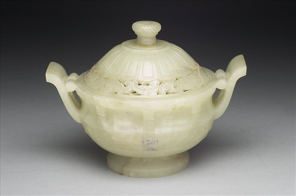 青玉圓爐,圈足略高,兩側有朝冠耳,帶蓋。口沿、足沿皆琢回紋;腹有扉棱和回紋地夔鳳紋;蓋面內圈琢飾蓮瓣紋、外圈鏤雕花葉紋,蓋鈕飾以紐絲紋。為香具,與香瓶、香盒三件一組。